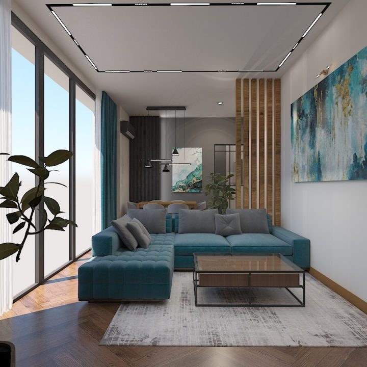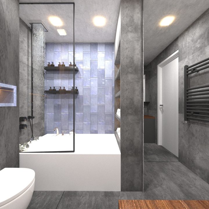 მისაღები-სამზარეულოსაძინებელიშემოსასვლელიაბაზანამასალები: 3D პანელები, ხე , ლამინატიფერები: თეთრი, ნაცრისფერი, ხისფერი, ლურჯი