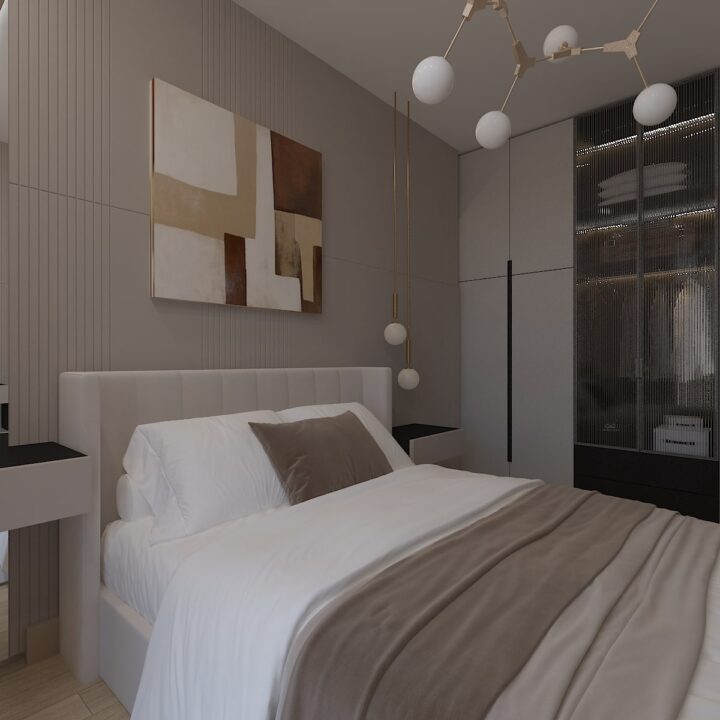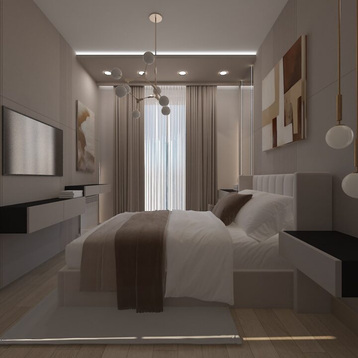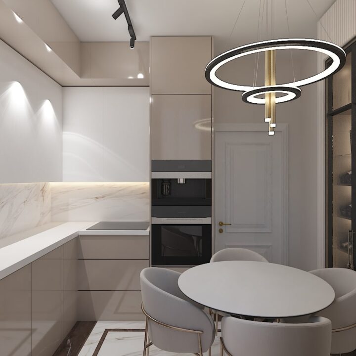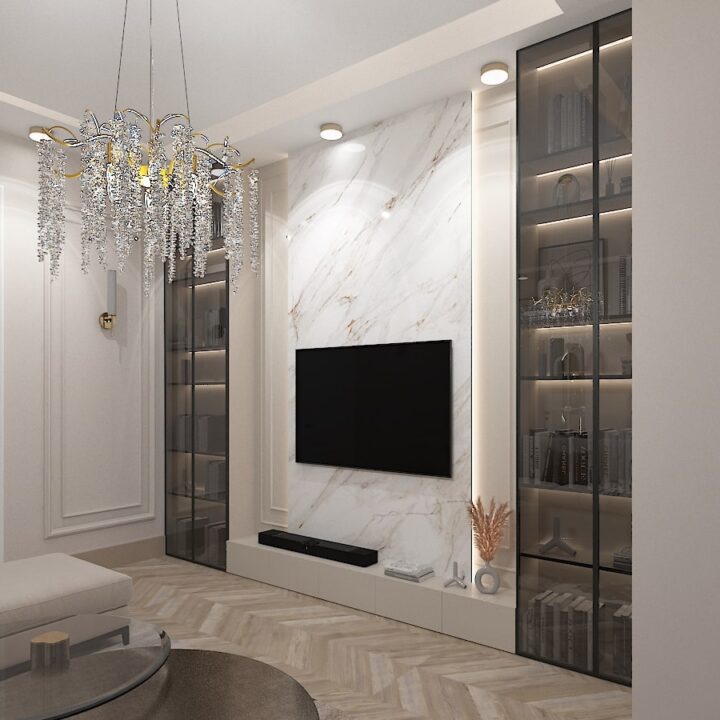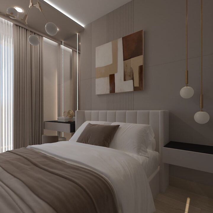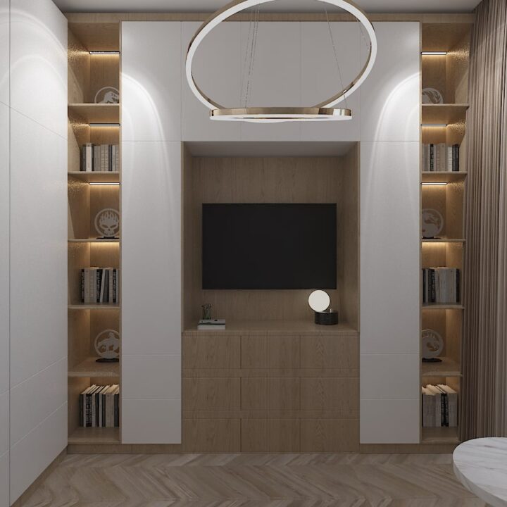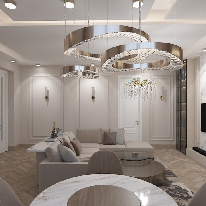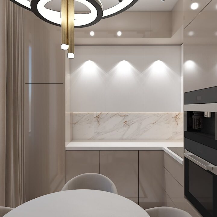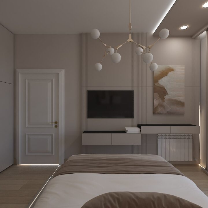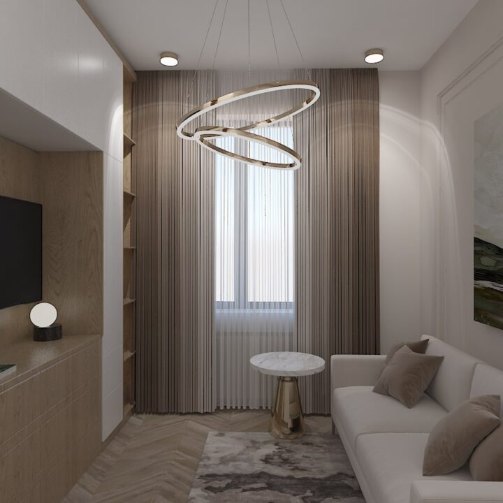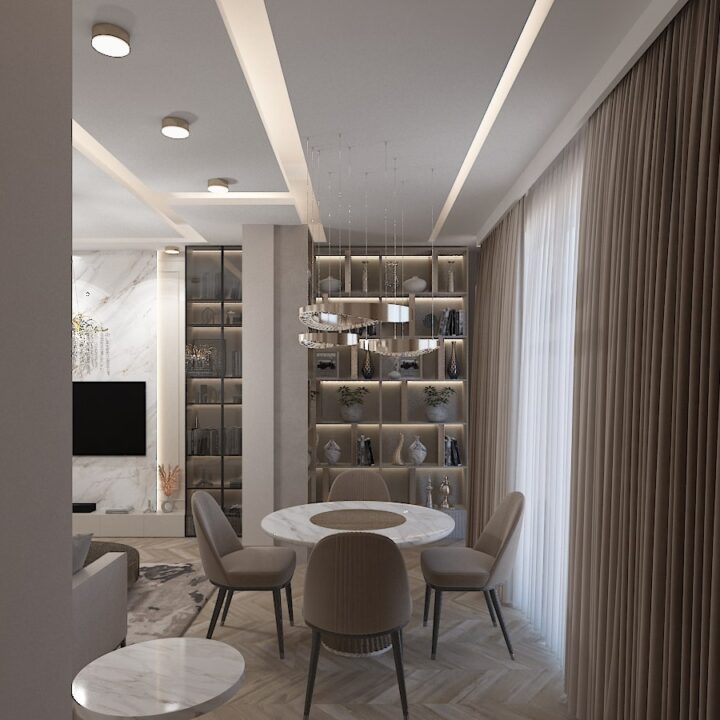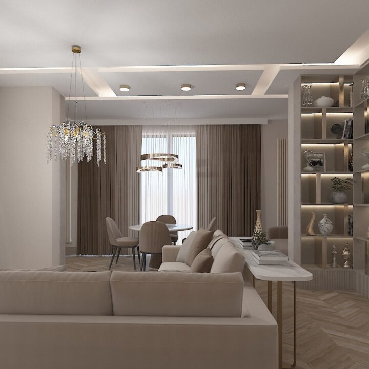 ჩვენს მიერ შესრულებული 97 კვადრატული ბინის დიზაინი კრემისფერ ტონალობებში