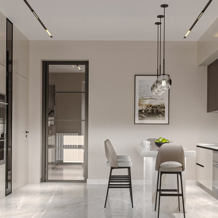 ჩვენს მიერ შესრულებული კერძო სახლის დიზაინი – მისაღები- ჰოლი, სამზარეულო, საძინებელი და ტერასა