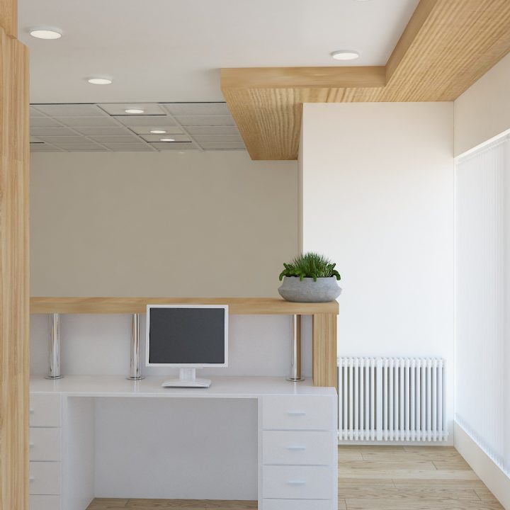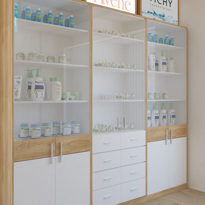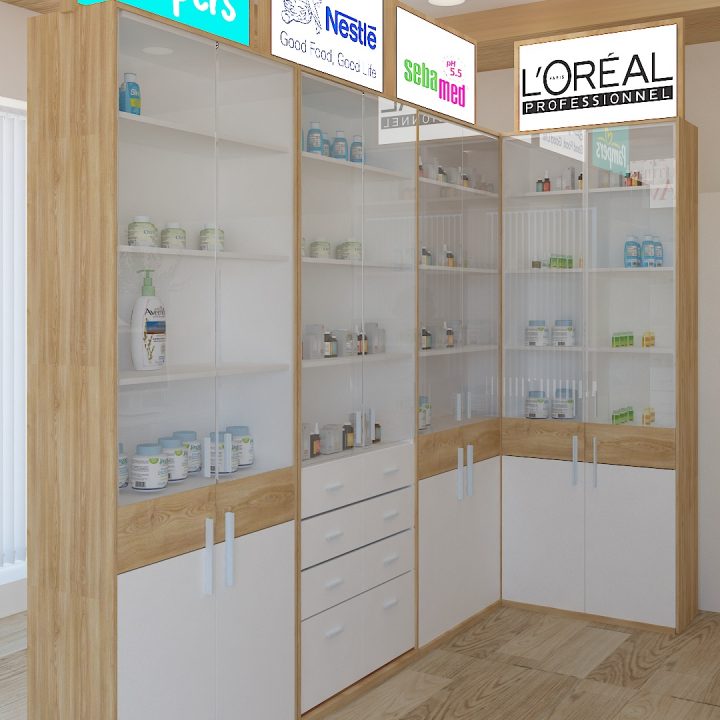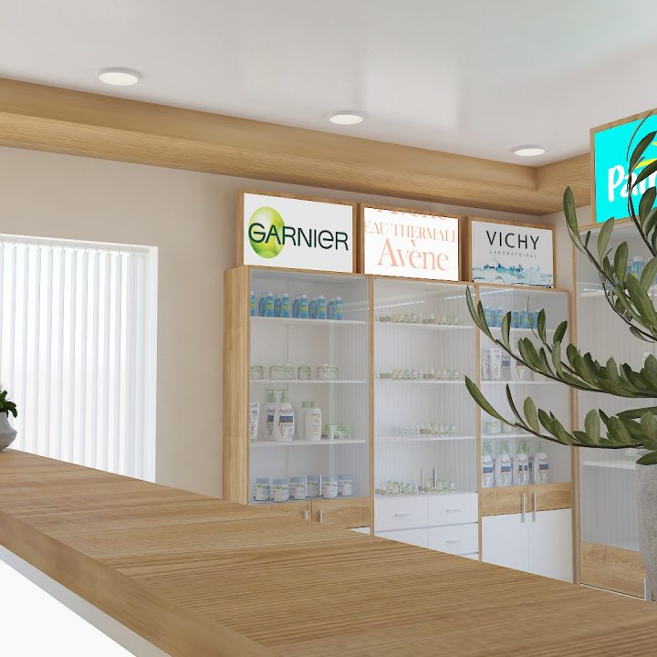 აფთიაქის დიზიანი საჩხერის სამედიცინო ცენტრისთვის აფთიაქი გაფორმებულია თეთრ და ხისფერ ფერებში