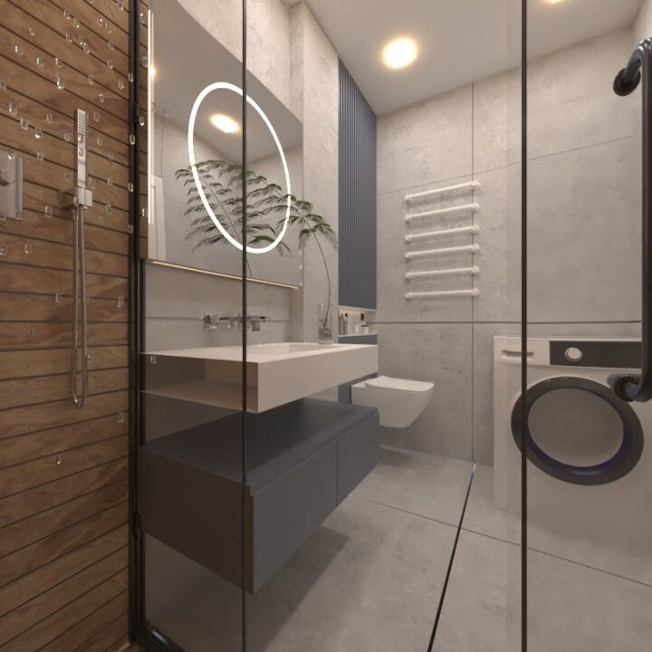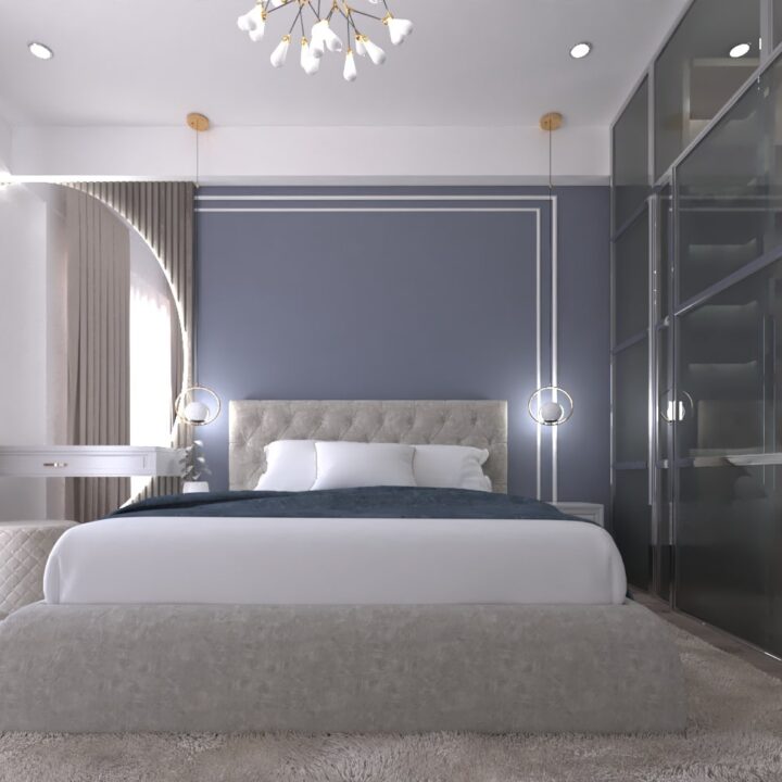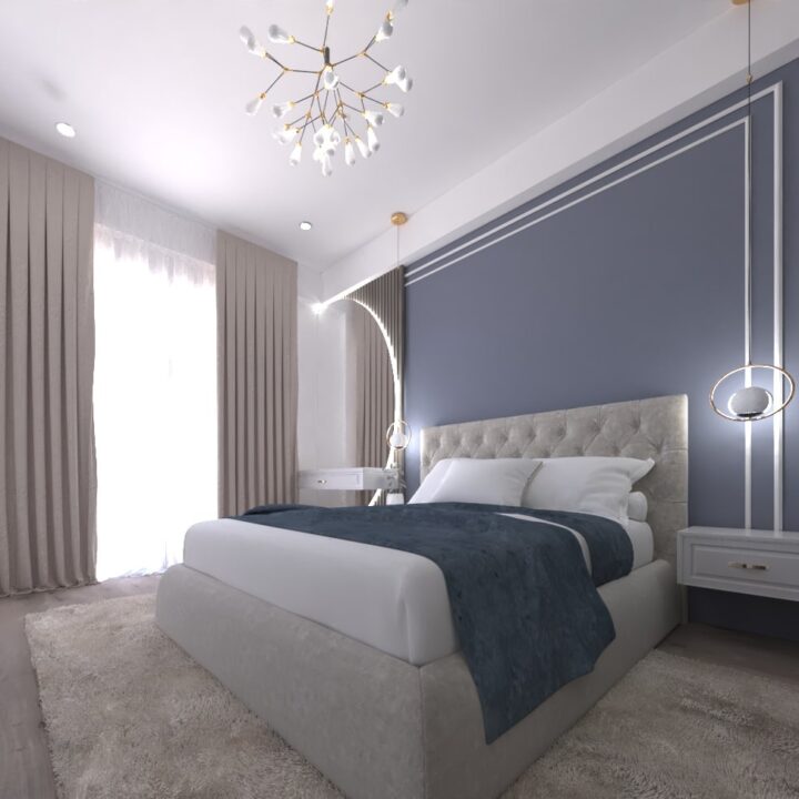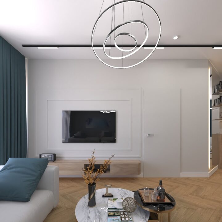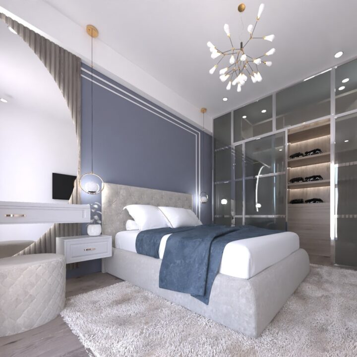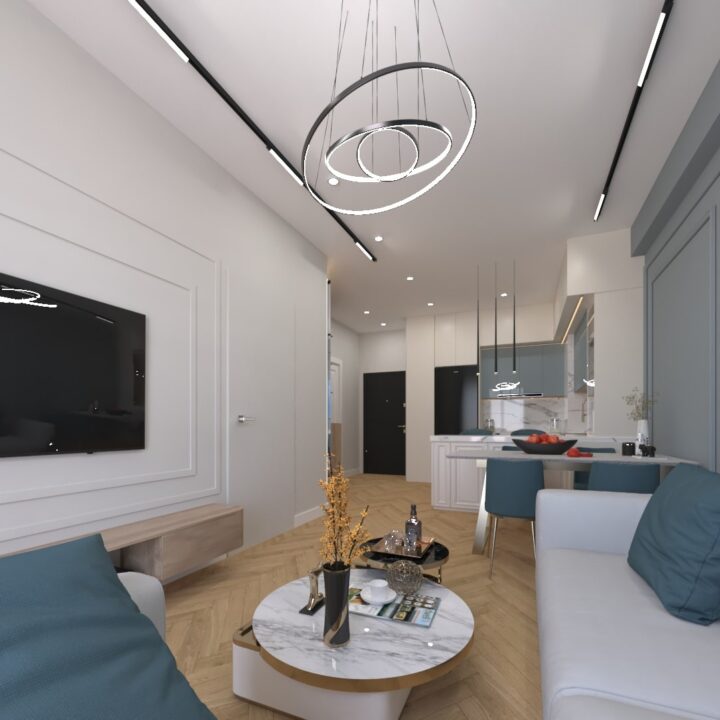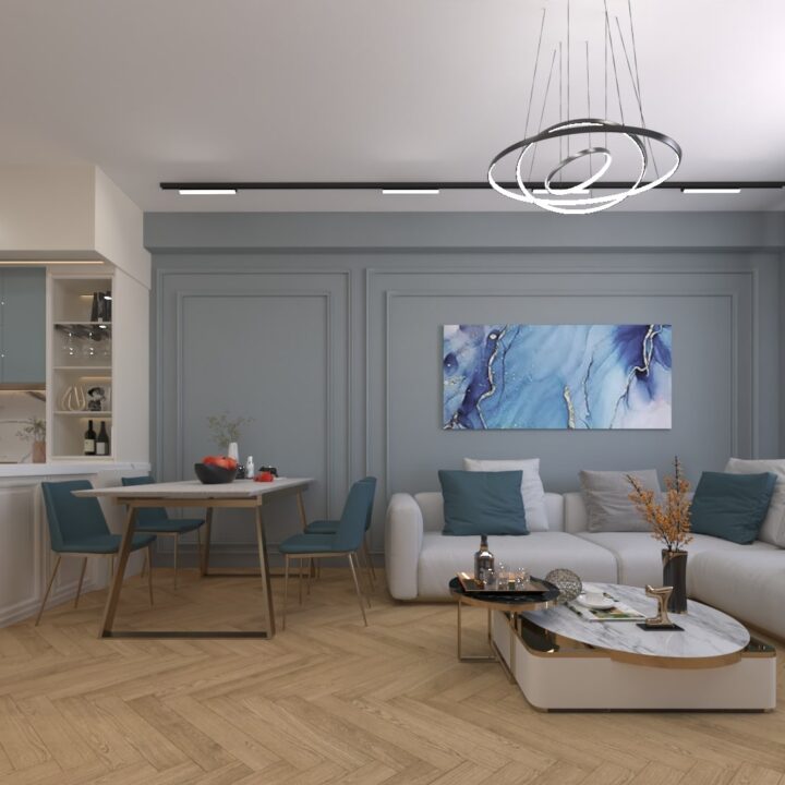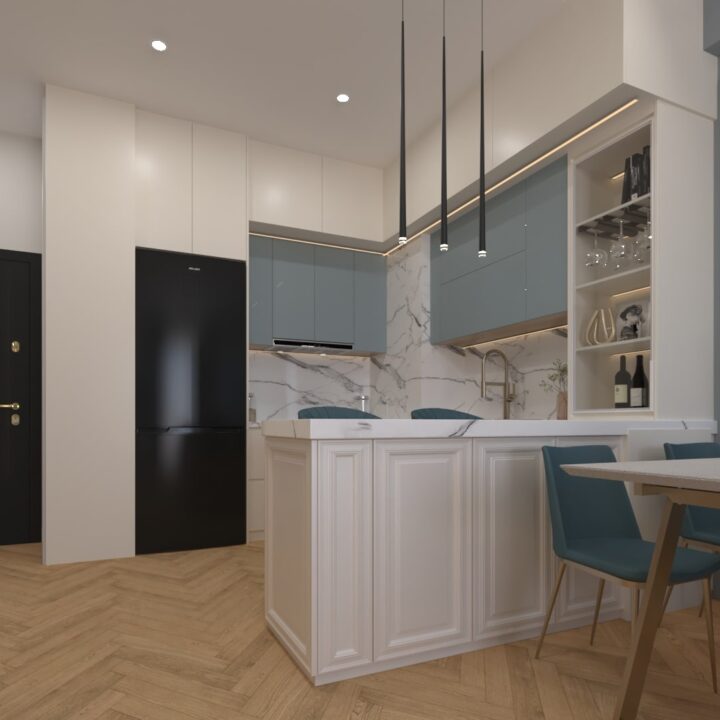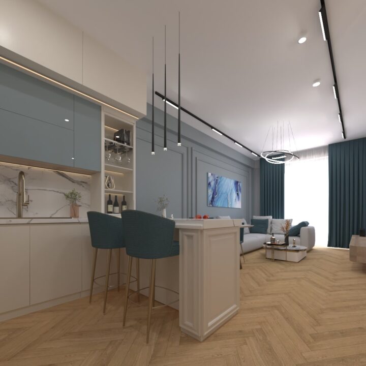 ჩვენს მიერ შესრულებული ბინის დიზაინი ლურჯ ტონალობებში – 60 კვადრატული