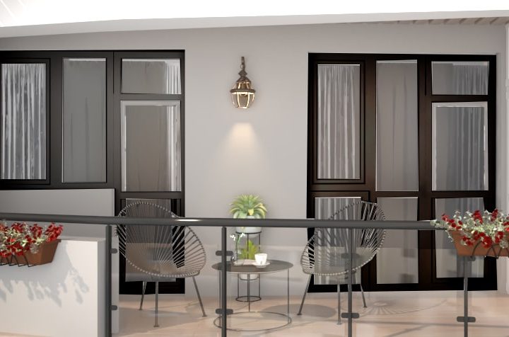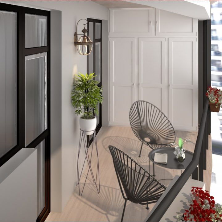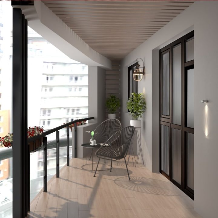 მისაღები – სამზარეულო გამოყოფილი მინის ვიტრაჟით. საძინებელი გარდერობით , აბაზანა და ტერასა