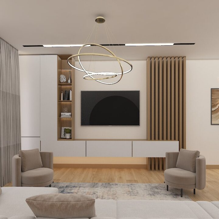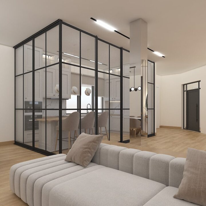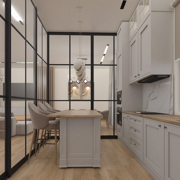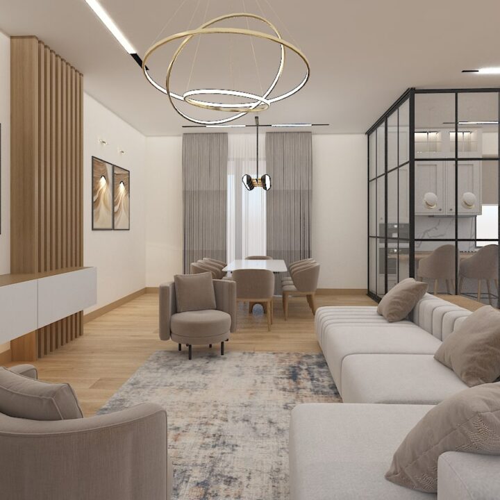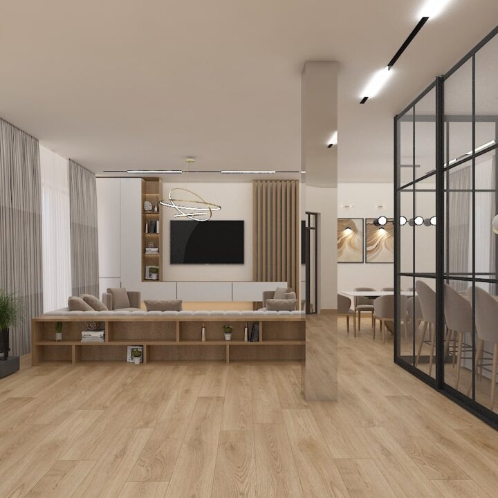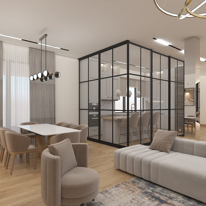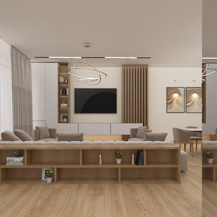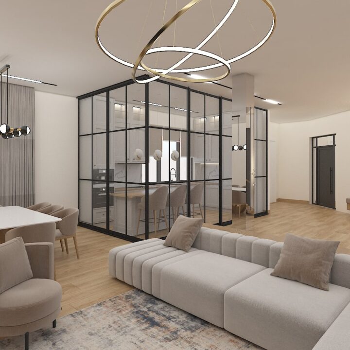 ჩვენს მიერ შესრულებული კერძო სახლის მისაღები სამზარეულო ჰოლის დიზაინი