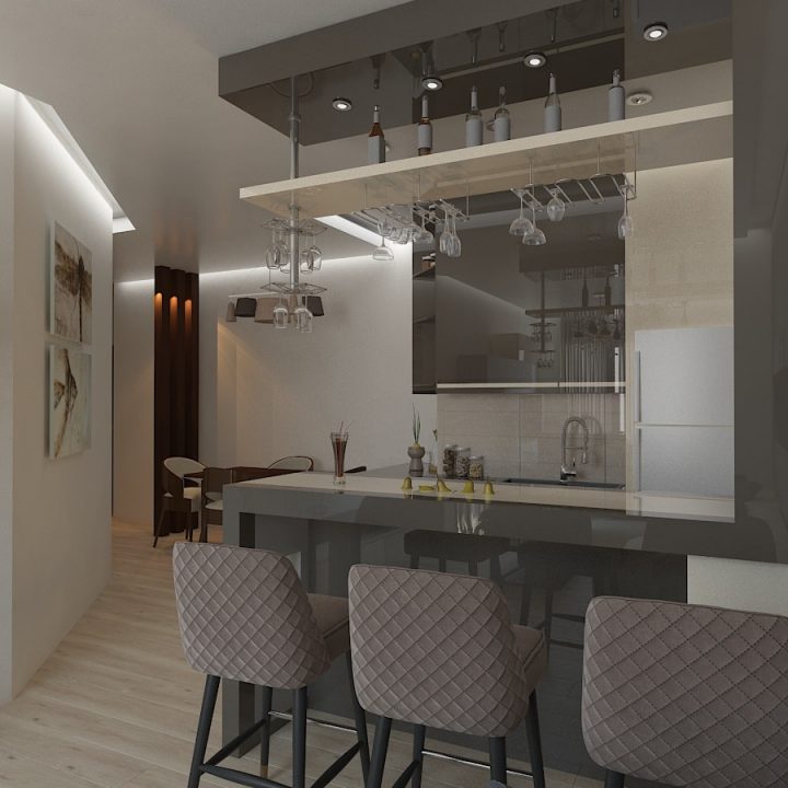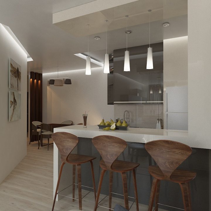 სტუდიო ტიპის მისაღები სამზარეულო – გადაწყვეტილი ღია ფერებში