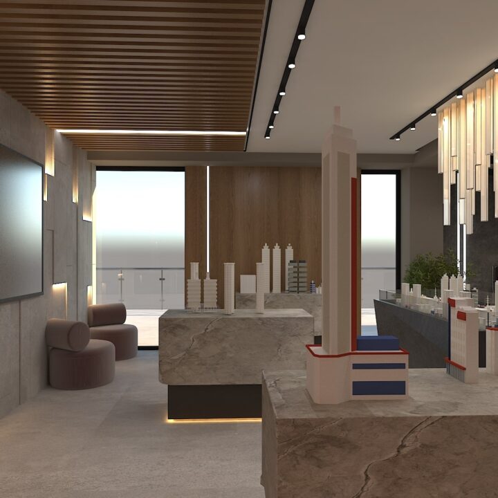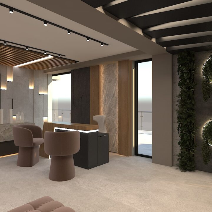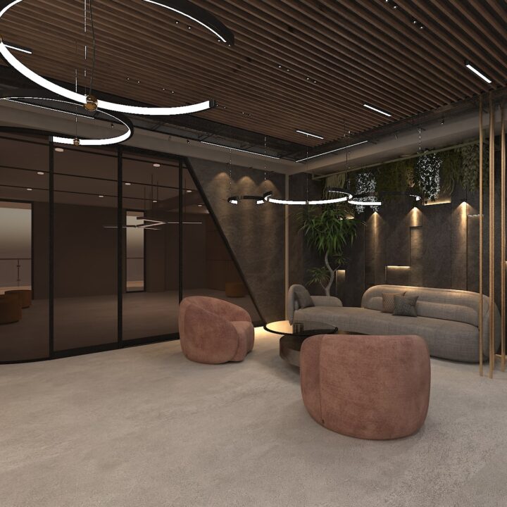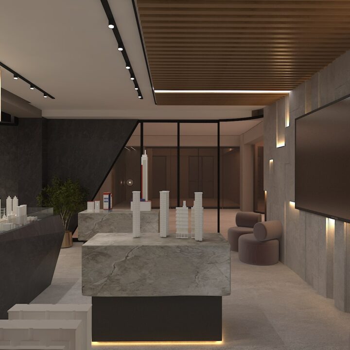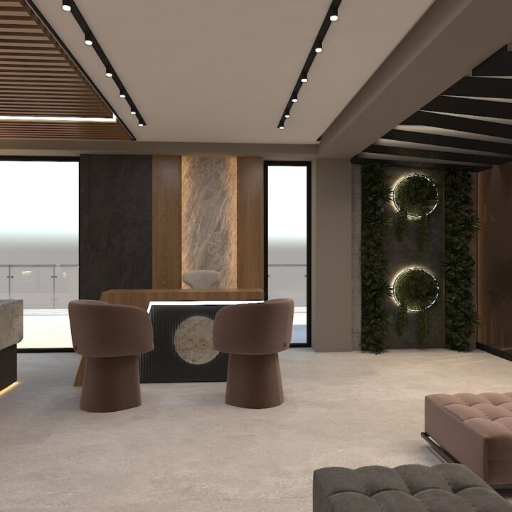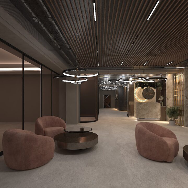 ოფისი განლაგებულია 1 სართულზე და მისი კვადრატობა შეადგენს ჯამში 500 კვადრატს: განთავსებულია დიდი მიმღები, სივრცეში არის : აბაზანები, სასადილო ოთახი, შორუმების რამდენიმე ოთახი, ოთახი იურისტებისათვის და ბუღალტრებისათვის, დირექტორის ოთახი, საწყობი, ტექნიკური ოთახი , მაკეტების ოთახი და ყველაფერი იმისათვის რომ თანამშრომლებს ქონდეთ იდეალური სამუშაო გარემო . სივრცეს განსაკუთრებულად უცხოს ხდის , დიდი ქვის ფილების დეკორები, განათებები და ხის ჭერი
