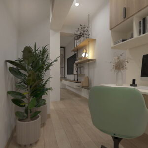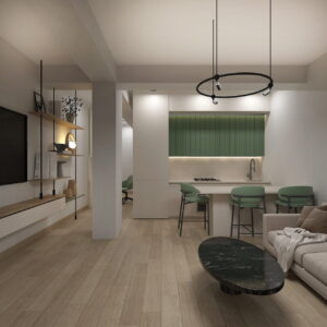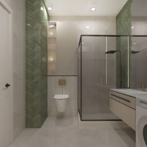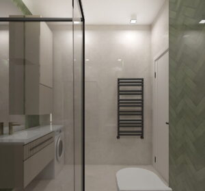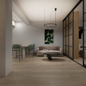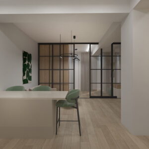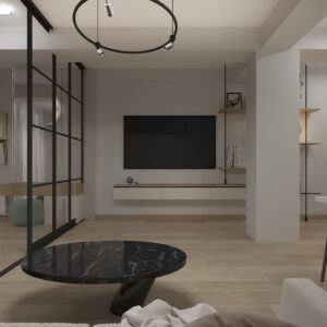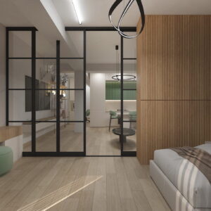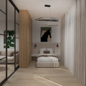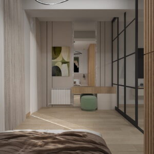 ჩვენ მიერ შესრულებული 53 მ2 ბინის დიზაინი ვიტრაჟით გამოყოფილი საძინებლით