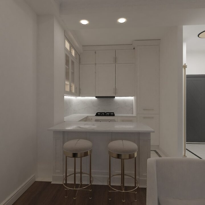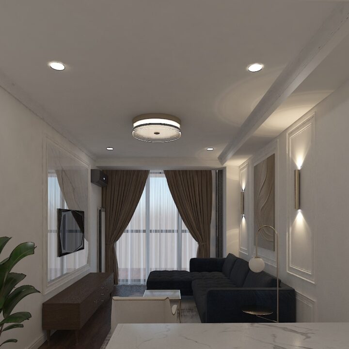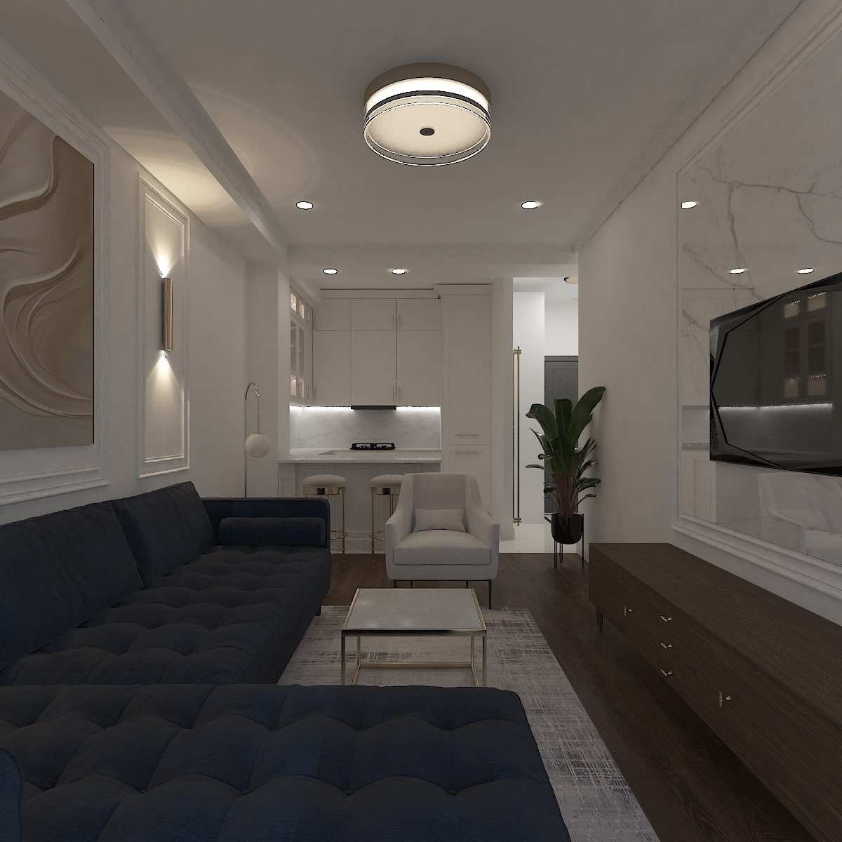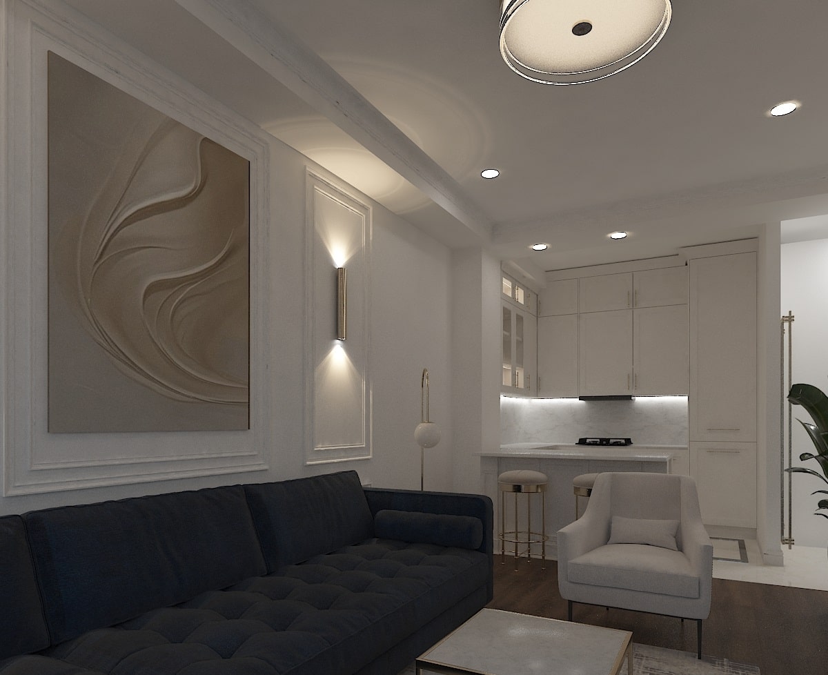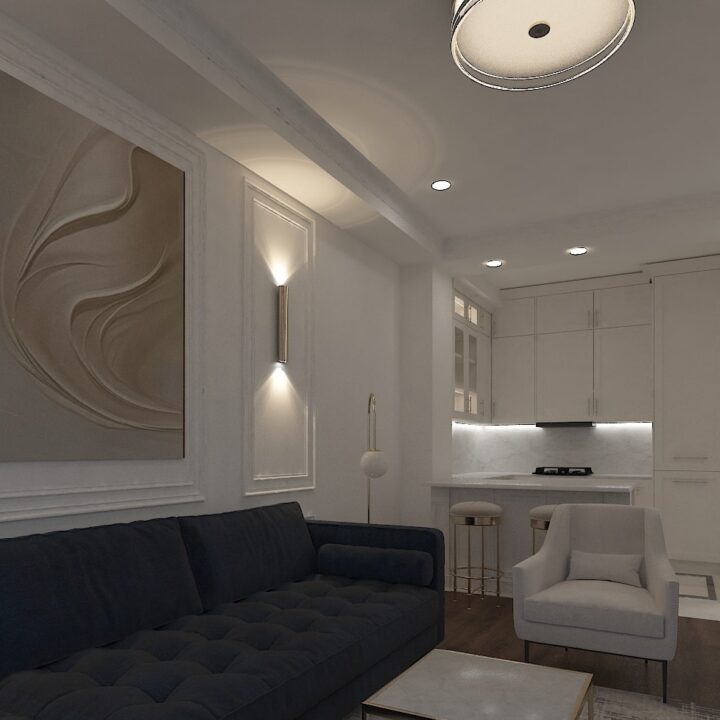 64.5 კვადრატული მეტრი ბინის დიზაინი ორთაჭალაში – სტუდიო მისაღები სამზარეულოთი , ერთი საძინებლითა და აბაზანით