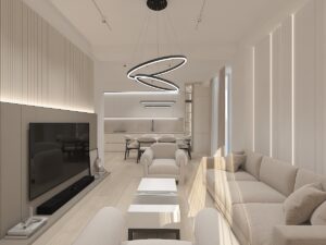 ინტერიერი აერთიანებს ფუნქციურ დაგეგმარებას და თბილ, თანამედროვე დიზაინს.